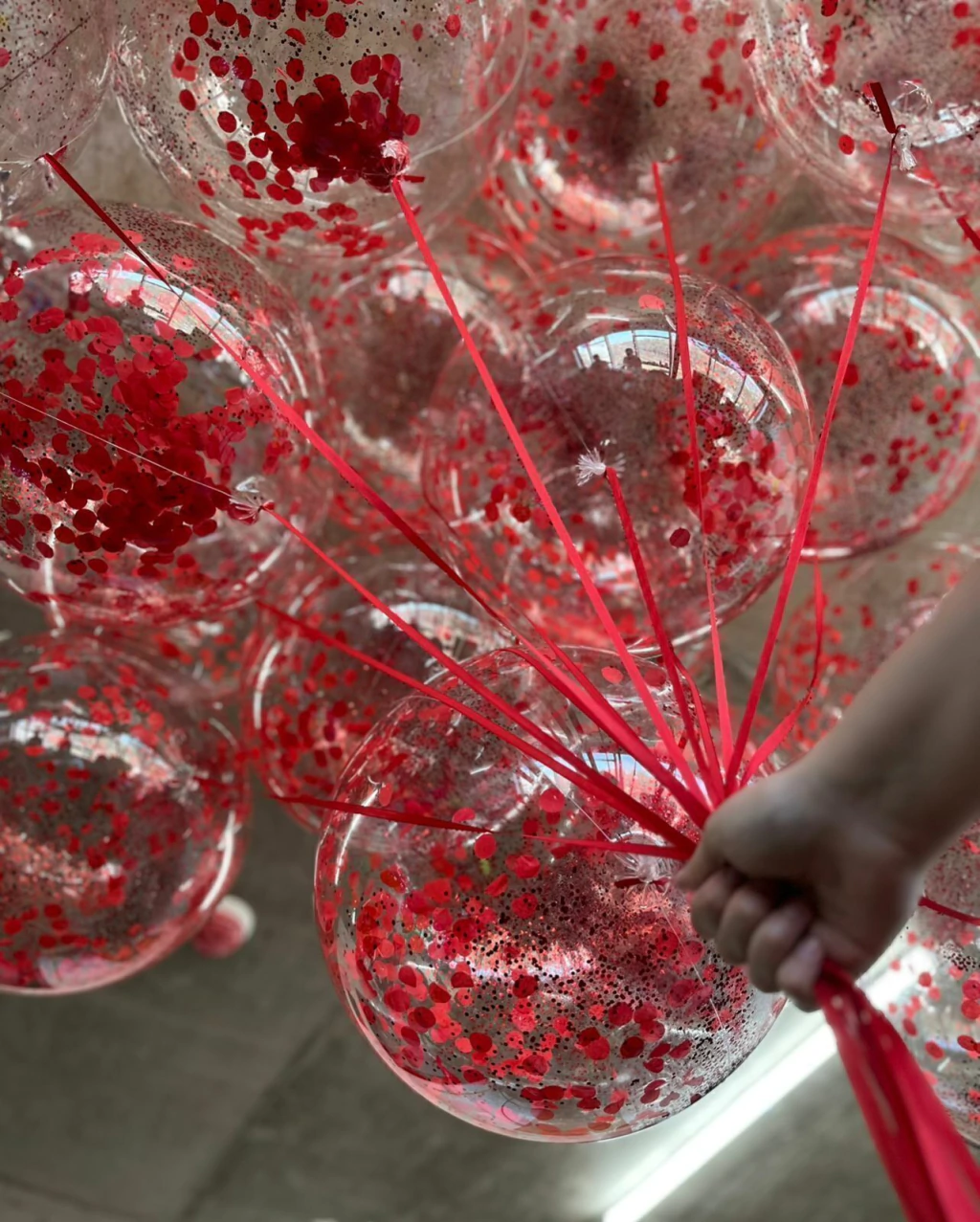 Nuestro bouquet está compuesto por 20 burbujas rellenas de confeti y glitter, con cintas de tela a tono que lo hacen aún más elegante.
